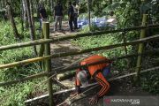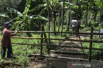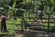 Warga menorobos pagar bambu menuju ke tempat pemakaman di Dusun Landeuh, Desa Sindangherang, Kabupaten Ciamis, Jawa Barat, Kamis (24/12/2020). Jalan menuju tempat pemakaman umum ditutup menggunakan bambu dan satu makam dari salah satu tim sukses calon dipindahkan oleh pemilik tanah yang merupakan salah satu calon kades yang kalah dalam Pilkades serentak 19 Desember 2020 lalu. ANTARA FOTO/Adeng Bustomi/aww.