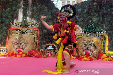 Seniman menampilkan Tari Reog Ponorogo dalam Festival Budaya Pecut Pusaka Ksatria Mahottama 2020 di Puri Grenceng Pemecutan, Denpasar, Bali, Sabtu (26/12/2020). Festival yang menampilkan berbagai kesenian khas daerah tersebut merupakan rangkaian upaya membangkitkan budaya peninggalan Kerajaan Badung sekaligus untuk melestarikannya agar tidak hilang ditelan zaman. ANTARA FOTO/Nyoman Hendra Wibowo/aww.