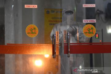Petugas merapikan sarung tangannya di tempat isolasi pasien OTG COVID-19 di Graha Wisata Ragunan, Jakarta, Sabtu (26/12/2020). Kasus positif COVID-19 di Indonesia hingga Sabtu (26/12) telah menembus angka 706.837 kasus sejak pertama kali diumumkan pada 2 Maret lalu dengan positivity rate 20,6 persen. ANTARA FOTO/Indrianto Eko Suwarso/aww.