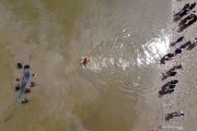 Petugas BKSDA Seksi Konservasi II Sulawesi Tenggara berusaha menyelamatkan seekor hiu paus tutul (Rhincodon typus) yang terdampar di Sungai Wanggu, Kendari, Sulawesi Tenggara, Sabtu (2/1/2021). Seekor hiu paus tutul dengan panjang sekitar empat meter ditemukan warga terdampar di Sungai Wanggu akibat air sungai surut dan membuat tim BKSDA kesulitan mengevakuasi satwa itu hingga ke Teluk Kendari dan harus mendorong sekitar lima kilometer. ANTARA FOTO/Jojon/wsj.