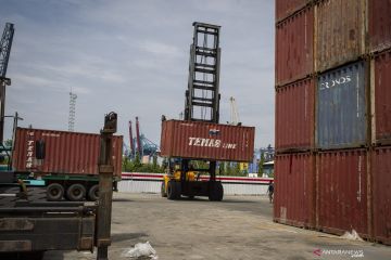 Suasana aktivitas bongkar muat peti kemas di Pelabuhan Tanjung Priok, Jakarta Utara, Sabtu (2/1/2021). Ketua Umum Asosiasi Logistik Indonesia (ALI) Zaldi Ilham Masita mengatakan kelangkaan peti kemas terjadi di seluruh dunia karena belum pulihnya perdagangan dunia akibat dari pandemi COVID-19 dan belum berimbangnya aliran peti kemas secara internasional. ANTARA FOTO/Dhemas Reviyanto/wsj.