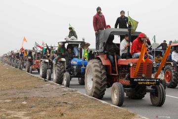 Para petani berpartisipasi dalam pawai traktor untuk memprotes tagihan pertanian yang baru disahkan, di perbatasan Singhu dekat New Delhi, India, Kamis (7/1/2021). ANTARA FOTO/Reuters-Adnan Abidi/hp.