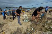 Relawan pemerhati lingkungan membersihkan sampah plastik dalam beach cleanup and brand audit, di Pantai Kedonganan, Badung, Bali, Sabtu (9/1/2021). Kegiatan tersebut untuk mengedukasi masyarakat mengenai bahaya sampah plastik bagi kehidupan laut yang digelar di lima titik pantai, yaitu Pantai Petitenget, Pantai Legian, Pantai Kuta, Pantai Jerman dan Pantai Kedonganan. ANTARA FOTO/Nyoman Hendra Wibowo/hp.