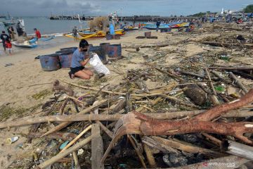 Relawan pemerhati lingkungan menghitung jumlah merek sampah plastik untuk didata dalam beach cleanup and brand audit, di Pantai Kedonganan, Badung, Bali, Sabtu (9/1/2021). Kegiatan tersebut untuk mengedukasi masyarakat mengenai bahaya sampah plastik bagi kehidupan laut yang digelar di lima titik pantai, yaitu Pantai Petitenget, Pantai Legian, Pantai Kuta, Pantai Jerman dan Pantai Kedonganan. ANTARA FOTO/Nyoman Hendra Wibowo/hp.