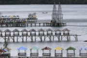 Wisatawan domestik mengunjungi miniatur menara Petronas yang dibangun untuk mengembangkan pariwisata bahari di pesisir pantai Lhok Seudu, Aceh Besar, Aceh, Sabtu (9/1/2021). Kementerian Pariwisata dan Ekonomi Kreatif akan melaksanakan sinergi atau kerjasama dengan berbagai pihak untuk memulihkan sektor wisata termasuk wisata bahari yang terpuruk akibat pandemi COVID-19. ANTARA FOTO/Irwansyah Putra/hp.
