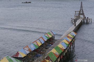 Wisatawan domestik mengunjungi miniatur menara eiffel yang dibangun untuk mengembangkan pariwisata bahari di pesisir pantai Lhok Seudu, Aceh Besar, Aceh, Sabtu (9/1/2021). Kementerian Pariwisata dan Ekonomi Kreatif akan melaksanakan sinergi atau kerjasama dengan berbagai pihak untuk memulihkan sektor wisata termasuk wisata bahari yang terpuruk akibat pandemi COVID-19. ANTARA FOTO/Irwansyah Putra/hp.