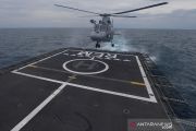 Helikopter Panther AS 565 MBe HS-4210 TNI AL bersiap mendarat saat operasi SAR kecelakaan pesawat Sriwijaya Air SJ182 di KRI RE Matadinata 331, perairan Kepulauan Seribu, Jakarta, Minggu (10/1/2021). ANTARA FOTO/Sigid Kurniawan/aww.