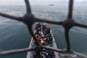 Alat berat dioperasikan untuk menurunkan sekoci saat operasi SAR kecelakaan pesawat Sriwijaya Air SJ182 di KRI John Lie 358, perairan Kepulauan Seribu, Jakarta, Minggu (10/1/2021). ANTARA FOTO/Sigid Kurniawan/aww.