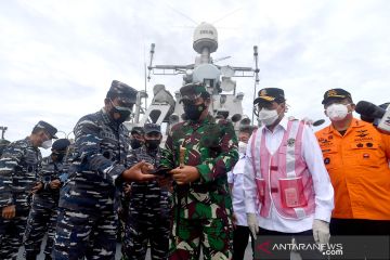 Panglima TNI Marsekal TNI Hadi Tjahjanto (ketiga kanan) bersama Menhub Budi Karya Sumadi (kanan) didampingi Wakasal Laksamana Madya TNI Ahmadi Heri Purwono (kedua kiri) dan Kepala Basarnas Marsekal Madya TNI Bagus Puruhito (kanan) melihat temuan serpihan dan sejumlah barang dari sisa pesawat Sriwijaya Air SJ182 di KRI John Lie 358, perairan Kepulauan Seribu, Jakarta, Minggu (10/1/2021). ANTARA FOTO/Sigid Kurniawan/aww.