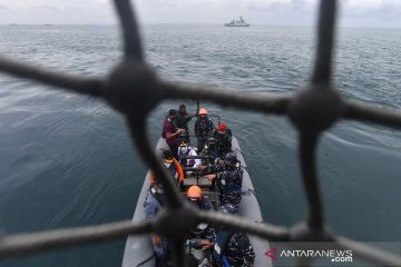 Panglima TNI Marsekal TNI Hadi Tjahjanto (tengah, duduk kanan) bersama Menhub Budi Karya Sumadi (tengah, duduk kiri) didampingi Wakasal Laksamana Madya TNI Ahmadi Heri Purwono (kanan) berada di atas sekoci saat meninjau operasi SAR kecelakaan Sriwijaya Air SJ182 di KRI John Lie, perairan Kepulauan Seribu, Jakarta, Minggu (10/1/2021). ANTARA FOTO/Sigid Kurniawan/aww.