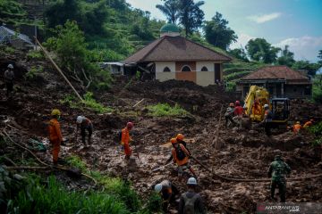 Anggota Basarnas, TNI, Polri dan relawan melakukan pencarian korban bencana tanah longsor di Cimanggung, Kabupaten Sumedang, Jawa Barat, Selasa (12/1/2021). Tim SAR gabungan masih mencari sedikitnya 24 korban hilang yang telah terdata akibat bencana tanah longsor yang terjadi pada Sabtu (9/1) lalu. ANTARA FOTO/Raisan Al Farisi/hp.