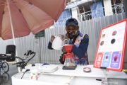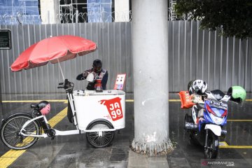 Barista Jago Coffee menyeduh kopi di atas sepeda listrik di kawasan Bendungan Hilir, Jakarta, Selasa (12/1/2021). Kedai kopi keliling yang bisa dipanggil melalui aplikasi dalam jaringan (online) itu dimanfaatkan warga Jakarta yang ingin menikmati seduhan kopi di saat Pemberlakuan Pembatasan Kegiatan Masyarakat (PPKM). ANTARA FOTO/Hafidz Mubarak A/foc.