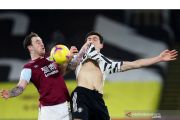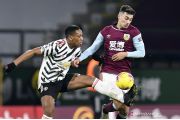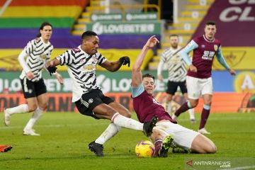 Pesepak bola Manchester United Anthony Martial (kiri) berebut bola dengan pesepak bola Butnley Matthew Lowton dalam laga pekan ke-17 Liga Inggris, di Stadion Turf Moor, Burnley, Inggris, Selasa (12/1/2021). Manchester United menang 1-0 atas Burney lewat sumbangan satu-satu nya gol yang diciptakan Paul Pogba dan merebut puncak klasemen sementara dari Liverpool. ANTARA FOTO/Pool via Reuters- Clive Brunskill/hp.