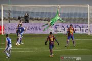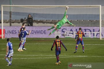 Kiper Barcelona Marc-Andre ter Stegen menepis bola tendangan pemain Real Sociedad Joseba Zaldua pada babak semifinal Piala Super Spanyol di Nuevo Arcangel, Cordoba, Spanyol (13/1/2021). Barcelona berhasil lolos ke babak final Piala Super Spanyol seusai mengalahkan Real Sociedad melalui drama adu penalti 3-2 setelah kedua tim bermain imbang 1-1. ANTARA FOTO/REUTERS/Jon Nazca/aww.