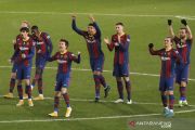 Para pemain Barcelona bereaksi saat adu penalti pada babak semifinal Piala Super Spanyol melawan Real Sociedad di Nuevo Arcangel, Cordoba, Spanyol (13/1/2021). Barcelona berhasil lolos ke babak final Piala Super Spanyol seusai mengalahkan Real Sociedad melalui drama adu penalti 3-2 setelah kedua tim bermain imbang 1-1. ANTARA FOTO/REUTERS/Jon Nazca/aww.