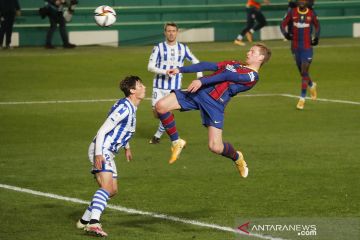 Pemain Barcelona Frenkie de Jong mencetak gol pada babak semifinal Piala Super Spanyol melawan Real Sociedad di Nuevo Arcangel, Cordoba, Spanyol (13/1/2021). Barcelona berhasil lolos ke babak final Piala Super Spanyol seusai mengalahkan Real Sociedad melalui drama adu penalti 3-2 setelah kedua tim bermain imbang 1-1. ANTARA FOTO/REUTERS/Jon Nazca/aww.