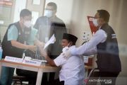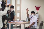 Wakil Gubernur Jawa Barat Uu Ruzhanul Ulum (kanan) melambaikan tangan sebelum vaksinasi COVID-19 Sinovac di Rumah Sakit Hasan Sadikin (RSHS), Bandung, Jawa Barat, Kamis (14/1/2021). Uu Ruzhanul Ulum menjadi orang pertama di Provinsi Jawa Barat yang menerima vaksinasi COVID-19 Sinovac menandakan dimulainya program vaksinasi massal di sejumlah daerah di Jawa Barat. ANTARA FOTO/M Agung Rajasa/aww.
