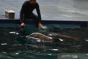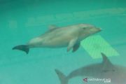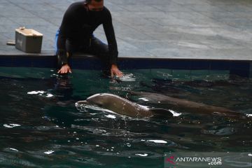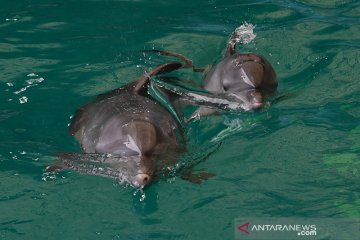 Bayi Lumba-lumba Hidung Botol (Tursiops truncatus) yang berjenis kelamin betina dan bernama Uchuy (kanan) bermain bersama induknya di Taman Safari Prigen, Pasuruan, Jawa Timur, Jumat (15/1/2021). Uchuy yang lahir normal pada 16 Oktober 2020 tersebut merupakan Lumba-lumba Hidung Botol pertama yang lahir di taman itu sehingga menambah koleksi Lumba-lumba Hidung Botol di taman tersebut menjadi lima ekor . ANTARA FOTO/Zabur Karuru/aww.