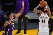 Pebasket New Orleans Pelicans forward Brandon Ingram (kanan) berupaya memasukkan bola ke ring lawan dan dojaga pebasket Los Angeles Lakers Anthony Davis (kiri) dalam laga lanjutan NBA, di Staples Center, Los Angeles, California, Amerikan Serikat, Jumat (15/1/2021). LA Lakers berhasil mengalahkan New Orleans Pelicans 112 - 95. ANTARA FOTO/REuters-Gary A. Vasquez-USA TODAY Sports/hp.