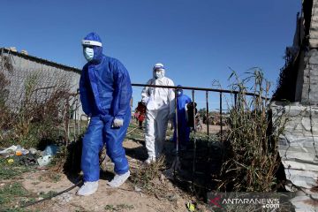 Petugas medis Palestina berjalan untuk mengambil sampel usap dari orang-orang untuk diuji penyakit coronavirus (COVID-19) di Jalur Gaza Selatan, Kamis (14/1/2021). ANTARA FOTO/REUTERS/Ibraheem Abu Mustafa/rwa.