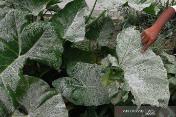 Warga menunjukan abu vulkanik Gunung Merapi yang menutupi daun di Songgo Bumi, Mriyan, Tamansari, Boyolali, Jawa Tengah, Selasa (19/1/2021). Terjadinya awan panas guguran Gunung Merapi pada Selasa (19/1) pukul 02.27 WIB dengan jarak luncur 1800 meter dan tinggi kolom 500 meter di atas puncak, membuat sebagian wilayah di daerah kaki Gunung Merapi Kabupaten Boyolali dan Kabupaten Klaten terkena hujan abu vulkanik. ANTARA FOTO/Aloysius Jarot Nugroho/rwa.
