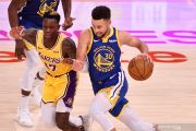 Pebasket Golden State Warriors Stephen Curry (kanan) membawa bola dan berupaya melewati hadangan pebasker Los Angeles Lakers Dennis Schroder (kiri) dalam laga NBA, di Staples Center, Los Angeles, California, Amerika Serikat, Senin (18/1/2020). Golden State Warriors menang tipis atas LA Lakers . ANTARA FOTO/Reuters-Robert Hanashiro-USA TODAY Sports/hp.