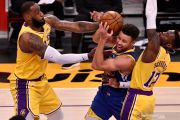 Pebasket Golden State Warrior Stephen Curry (tengah) berupaya melewati hadangan pebasket Los Angeles Lakers LeBron James (kiri) dan Dennis Schroder (kanan) dalam laga NBA, di Staples Center, Los Angeles, California, Amerika Serikat, Senin (18/1/2020). Golden State Warriors menang tipis atas LA Lakers 3. ANTARA FOTO/Reuters-Robert Hanashiro-USA TODAY Sports/hp.