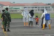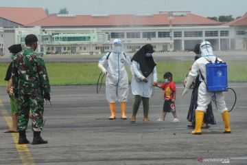 Petugas kesehatan menyemprotkan cairan desinfektan kepada pengungsi gempa bumi Majene dan Mamuju, Sulawesi Barat saat turun dari pesawat Hercules milik TNI Angkatan Udara di Landasan Udara Adi Soemarmo, Boyolali, Jawa Tengah, Kamis (21/1/2021). Sebanyak 102 warga pengungsi gempa bumi Majene dan Mamuju, Sulawesi Barat tersebut dipulangkan ke daerah asal kelahiran mereka yaitu Jawa Tengah dan Jawa Timur. ANTARA FOTO/Aloysius Jarot Nugroho/wsj.