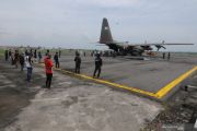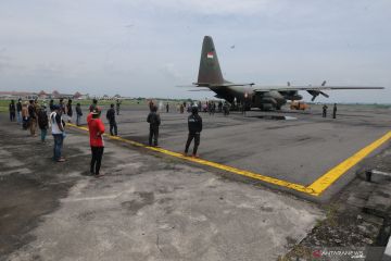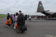 Sejumlah pengungsi gempa bumi Majene dan Mamuju, Sulawesi Barat turun dari pesawat Hercules milik TNI Angkatan Udara saat tiba di Landasan Udara Adi Soemarmo, Boyolali, Jawa Tengah, Kamis (21/1/2021). Sebanyak 102 warga pengungsi gempa bumi Majene dan Mamuju, Sulawesi Barat tersebut dipulangkan ke daerah asal kelahiran mereka yaitu Jawa Tengah dan Jawa Timur. ANTARA FOTO/Aloysius Jarot Nugroho/wsj.