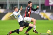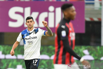 Pesepak bola Atalanta Cristian Romero (kiri) melakukan selebrasi setelah berhasil mencetak gola ke gawang AC Milan dalam laga pekan ke-19 LIga Italia, di Stadion San Siro, Milan, Italia, Sabtu (23/1/2021). Atalanta mengalahkan AC MIlan 3-0. ANTARA FOTO/Reuters-Daniele Mascolo/hp.