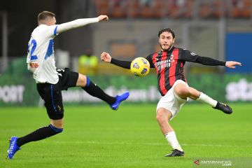 Pesepak bola AC Milan Davide Calabria (kanan) berebut bola dengan pesepak bola Atalanta Josip Ilicic (kiri) dalam laga pekan ke-19 LIga Italia, di Stadion San Siro, Milan, Italia, Sabtu (23/1/2021). Atalanta mengalahkan AC MIlan 3-0. ANTARA FOTO/Reuters-Daniele Mascolo/hp.