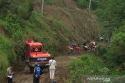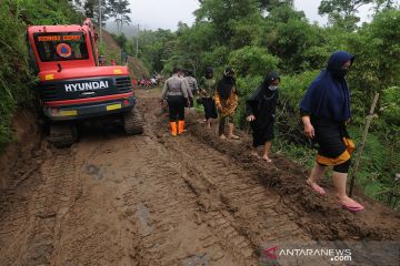 Sejumlah warga melintasi jalan yang tertutup tanah longsor di lereng Gunung Merapi, Cluntang, Musuk, Boyolali, Jawa Tengah, Selasa (26/1/2021). Hujan lebat pada Senin (25/1/2021), mengakibatkan terjadi tanah longsor yang menutupi akses jalan desa dan lahan pertanian, serta merenggut satu korban jiwa. ANTARA FOTO/Aloysius Jarot Nugroho/aww.