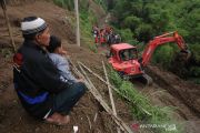 Warga melihat petugas Badan Penanggulangan Bencana Daerah (BPBD) Kabupaten Boyolali menggunakan alat berat saat membuka akses jalan yang tertutup tanah longsor di lereng Gunung Merapi, Cluntang, Musuk, Boyolali, Jawa Tengah, Selasa (26/1/2021). Hujan lebat pada Senin (25/1/2021), mengakibatkan terjadi tanah longsor yang menutupi akses jalan desa dan lahan pertanian, serta merenggut satu korban jiwa. ANTARA FOTO/Aloysius Jarot Nugroho/aww.