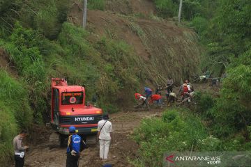Sejumlah warga bergotong royong membuka akses jalan yang tertutup tanah longsor di lereng Gunung Merapi, Cluntang, Musuk, Boyolali, Jawa Tengah, Selasa (26/1/2021). Hujan lebat pada Senin (25/1/2021), mengakibatkan terjadi tanah longsor yang menutupi akses jalan desa dan lahan pertanian, serta merenggut satu korban jiwa. ANTARA FOTO/Aloysius Jarot Nugroho/aww.