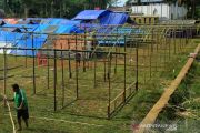 Pekerja menyelesaikan pembuatan rumah hunian sementara di Desa Botteng Utara, Mamuju, Sulawesi Barat, Selasa (26/1/2021). Pascagempa bumi magnitudo 6,2 yang terjadi pada Jumat (15/1) lalu, relawan peduli bencana membangun rumah hunian sementara bagi pengungsi sebanyak 50 unit di lokasi tersebut. ANTARA FOTO/Akbar Tado/rwa.