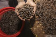 Pekerja menunjukkan pelet kayu di Tempat Pengolahan Sampah Setempat (TPSS), Sukmajaya, Depok, Jawa Barat, Jumat (29/1/2021). Pelet kayu yang terbentuk dari hasil pengolahan limbah kayu atau ranting pohon menjadi serbuk kayu yang dipadatkan tersebut termasuk dalam pemanfaatan biomassa sebagai jenis bahan bakar alternatif terbarukan yang ramah lingkungan. ANTARA FOTO/Asprilla Dwi Adha/foc.