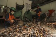 Pekerja mengolah limbah kayu atau ranting pohon menjadi pelet kayu di Tempat Pengolahan Sampah Setempat (TPSS), Sukmajaya, Depok, Jawa Barat, Jumat (29/1/2021). Pelet kayu yang terbentuk dari hasil pengolahan limbah kayu atau ranting pohon menjadi serbuk kayu yang dipadatkan tersebut termasuk dalam pemanfaatan biomassa sebagai jenis bahan bakar alternatif terbarukan yang ramah lingkungan. ANTARA FOTO/Asprilla Dwi Adha/foc.