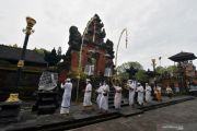 Pemuka Agama Hindu berdoa dalam persembahyangan Hari Saraswati di Pura Agung Jagatnatha, Denpasar, Bali, Sabtu (30/1/2021). Umat Hindu tetap merayakan persembahyangan Hari Saraswati yaitu hari turunnya ilmu pengetahuan pada saat Pemberlakuan Pembatasan Kegiatan Masyarakat (PPKM) dengan menerapkan protokol kesehatan dan membatasi jumlah umat yang berada di area pura. ANTARA FOTO/Nyoman Hendra Wibowo/wsj.
