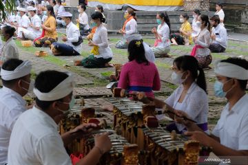 Umat Hindu melakukan persembahyangan Hari Saraswati di Pura Agung Jagatnatha, Denpasar, Bali, Sabtu (30/1/2021). Umat Hindu tetap merayakan persembahyangan Hari Saraswati yaitu hari turunnya ilmu pengetahuan pada saat Pemberlakuan Pembatasan Kegiatan Masyarakat (PPKM) dengan menerapkan protokol kesehatan dan membatasi jumlah umat yang berada di area pura. ANTARA FOTO/Nyoman Hendra Wibowo/wsj.