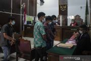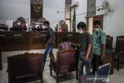 Terdakwa kasus kebakaran gedung utama Kejaksaan Agung, Halim (kanan), Tarno (kedua kanan), Karta (kedua kiri) dan Sahrul Karim (kiri) bersiap menjalani sidang perdana di Pengadilan Negeri Jakarta Selatan, Jakarta, Senin (1/2/2021). Sidang tersebut beragendakan pembacaan dakwaan dari Jaksa Penuntut Umum yang dihadiri langsung oleh enam terdakwa yakni Halim, Tarno, Karta, Sahrul Karim, Imam Sudrajat dan Uti Abdul Munir. ANTARA FOTO/Aprillio Akbar/rwa.