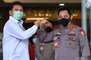 Kapolri Jenderal Pol Listyo Sigit Prabowo (kanan) memberikan salam kepada Jaksa Agung ST Burhanuddin (kiri) saat berkunjung ke Kejaksaan Agung di Jakarta, Rabu (3/2/2021). Kunjungan Kapolri tersebut untuk meningkatkan sinergi dan soliditas dengan Kejaksaan Agung serta membahas seputar percepatan berkas perkara. ANTARA FOTO/Sigid Kurniawan/wsj.