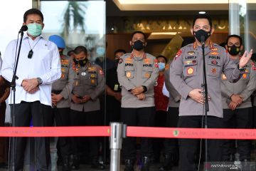 Kapolri Jenderal Pol Listyo Sigit Prabowo (kanan) bersama Jaksa Agung ST Burhanuddin (kiri) menyampaikan konferensi pers usai melakukan pertemuan di gedung Kejaksaan Agung, Jakarta, Rabu (3/2/2021). Kunjungan Kapolri tersebut untuk meningkatkan sinergi dan soliditas dengan Kejaksaan Agung serta membahas seputar percepatan berkas perkara. ANTARA FOTO/Sigid Kurniawan/wsj.