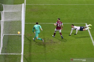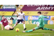 Pesepak bola Manchester City Raheem Sterling (tengah) menendang bola ke gawang yang dijaga penjaga gawang Burnley Burnley Nick Pope (kiri) dan membuat gol kedua untuk timnya dalam laga lanjutan Liga Inggris, di Stadion Turf Moor, Burnley, Inggris, Rabu (3/2/2021). Manchester City berhasil mengalahkan Burnley 2-0 . ANTARA FOTO/Pool via Reuters-Alex Pantling/hp.