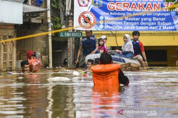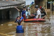 Petugas menggunakan perahu karet saat mengevakuasi warga yang rumahnya terendam banjir di Kawasan Rawajati, Kalibata, Jakarta, Senin (8/2/2021). Tingginya curah hujan di kawasan Bogor mengakibatkan ratusan rumah di enam RT Kelurahan Rawajati terendam banjir dengan ketinggian mencapai dua meter sehingga sejumlah warga diungsikan. ANTARA FOTO/Galih Pradipta/aww.