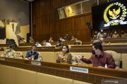 Wakil Ketua DPR Rachmat Gobel (tengah) berfoto bersama (dari kiri) Menteri ESDM Arifin Tasrif, Menteri Pertanian Syahrul Yasin Limpo, Menteri Keuangan Sri Mulyani Indrawati, dan Menteri BUMN Erick Thohir sebelum mengikuti rapat konsultasi dengan pimpinan DPR, di Kompleks Parlemen, Senayan, Jakarta, Selasa (9/2/2021). Rapat tersebut membahas masalah pupuk subsidi dalam peningkatan produksi pertanian. ANTARA FOTO/Dhemas Reviyanto/wsj.