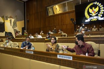 (dari kanan) Menteri BUMN Erick Thohir berbincang dengan Menteri Keuangan Sri Mulyani Indrawati, Menteri Pertanian Syahrul Yasin Limpo dan Menteri ESDM Arifin Tasrif sebelum mengikuti rapat konsultasi dengan pimpinan DPR di Kompleks Parlemen, Senayan, Jakarta, Selasa (9/2/2021). Rapat tersebut membahas masalah pupuk subsidi dalam peningkatan produksi pertanian. ANTARA FOTO/Dhemas Reviyanto/wsj.