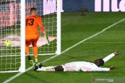 Pesepak bola Real Madrid Ferland Mendy (kanan) melakukan selebrasi setelah berhasil mencetak gol ke gawang Getafe yang di jaga penjaga gawang David Soria (kiri) dalam laga pekan ke-22 Liga Spanyol, di Stadion Alfredo Di Stefano, Madrid, Spanyol, Selasa (9/2/2021). Real Madrid berhasil mengalahkan Getafe 2-0. ANTARA FOTO/Reuters- Sergio Perez/hp.