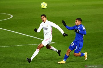 Pesepak bola Real Madrid Raphael Varane (kiri) berebut bola dengan pesepak bola Getafe Juan Hernandez dalam laga pekan ke-22 Liga Spanyol, di Stadion Alfredo Di Stefano, Madrid, Spanyol, Selasa (9/2/2021). Real Madrid berhasil mengalahkan Getafe 2-0. ANTARA FOTO/Reuters- Sergio Perez/hp.