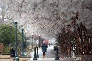 Seorang pejalan kaki berjalan di bawah pepohonan yang tertutup es selama cuaca dingin yang ekstrem di pusat kota Cleveland, Mississippi, AS, (11/2/2021). ANTARA FOTO/REUTERS / Rory Doyle/aww.