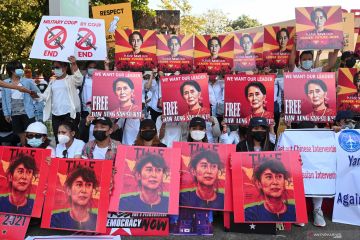 Para pengunjuk rasa mengangkat poster bergambar Aung San Suu Kyi saat mereka melakukan aksi protes menentang kudeta militer dan menuntut pembebasan pemimpin terpilih Aung San Suu Kyi, di Yangon, Myanmar, Sabtu (13/2/2021). ANTARA FOTO/Reuters-Stringer/hp.